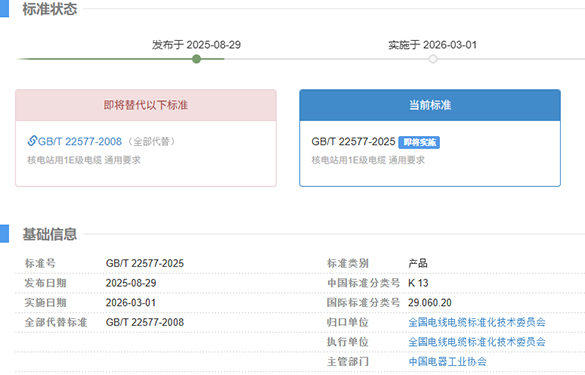 近日,國標(biāo)委發(fā)布公告,由江蘇上上電纜集團(tuán)有限公司、中國核電工程有限公司、生態(tài)環(huán)境部核與輻射安全中心、深圳中廣核工程設(shè)計有限公司、上海電纜研究所有限公司、上海核工程研究設(shè)計院股份有限公司、清華大學(xué)等核電監(jiān)管機(jī)構(gòu)、核電纜生產(chǎn)企業(yè)、核電設(shè)計院、核電運(yùn)行單位共同制定的GB/T 22577—2025《核電站用1E級電纜 通用要求》國家標(biāo)準(zhǔn)于2025年8月29日正式發(fā)布,將于2026年3月1日實(shí)施。